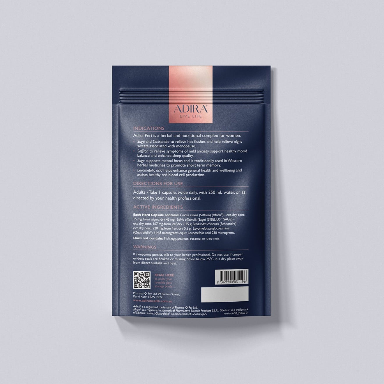 Adira Peri is formulated to relieve common symptoms of perimenopause and menopause including hot flushes, night sweats, mild anxiety, sleep quality, mental focus, short term memory, general health and wellbeing.
